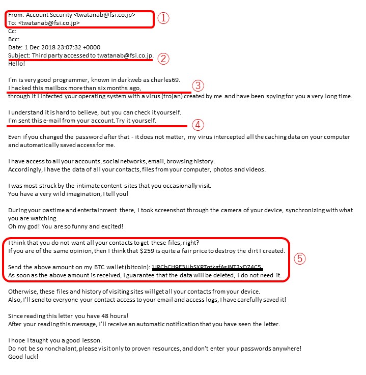 続けて序文で自己アピール。受信者に気に入ってもらえるかが序文に掛かっています。文字でしか表現できないので、自己アピールはとても重要です。英語のほうが自己主張が強い気がします。図2の例では、"I'm is very good programmer"と書いてありますが、本当に"very good"なプログラマならマルウェアは作りません。畳み掛けるように「あなたの○○をハック/クラックした」と攻撃宣言です。単刀直入で好感が持てます(いや、持てません)。そのハックした根拠として、あなたのアカウントからメールを送信したと書いてあります。これを謳うために、①のように差出人が受信者本人なのです。そして、実はここが引っ掛けです。実際はハックしていなくても、受信者のメールアドレスを使ってメールが送信できます。その説明は後ほど。