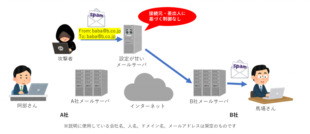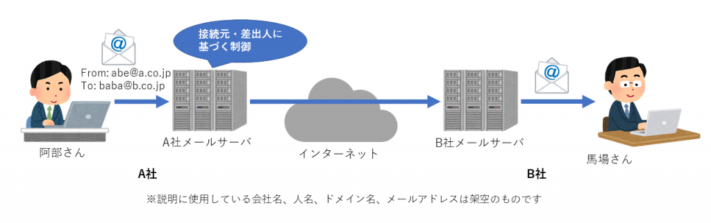 A社の阿部さんからB社の馬場さんにメールを送るケースを例に説明します(図3参照)。