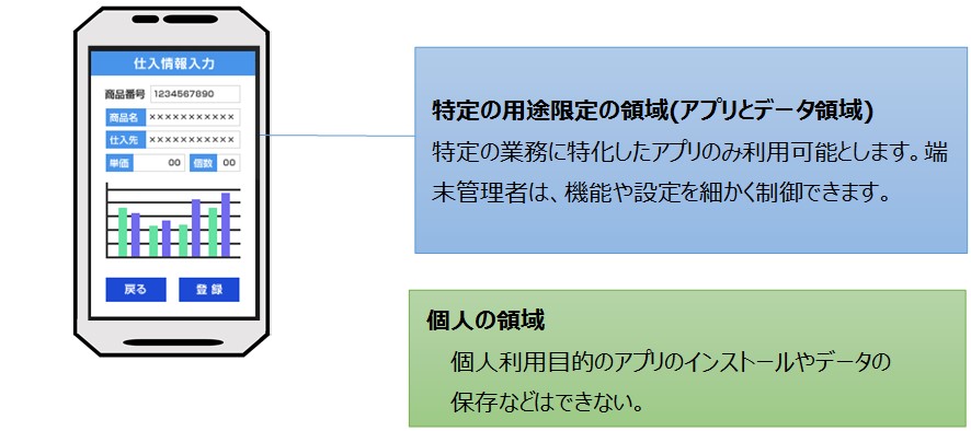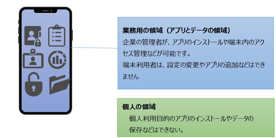 Androidは、個人端末に対して業務専用の領域を持たせることができます。これにより、個人の情報と企業の情報を完全に分離することができます。また、業務専用の領域、つまり企業が管理できる部分に関しては、必要に応じて企業の管理者側からアプリのインストールや機能制限を設定することが可能です。