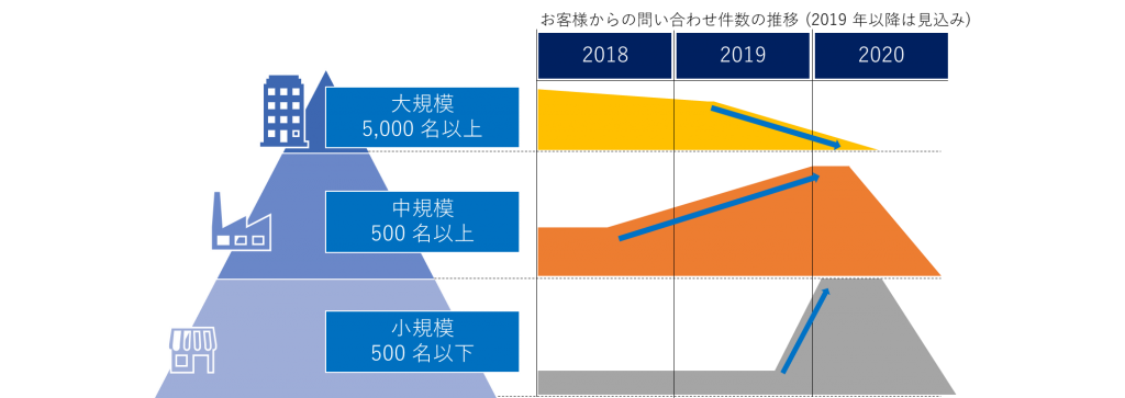 富士ソフトでは、すでに大規模のお客様からは多くのお問い合わせをいただきましたが、現在では、徐々に減少傾向にあります。逆に2018年の下期からは、中規模のお客様からのお問い合わせが徐々に増加しつつあります。小規模のお客様は、2019年終わり頃から駆け込み需要が出てくると予想しています。