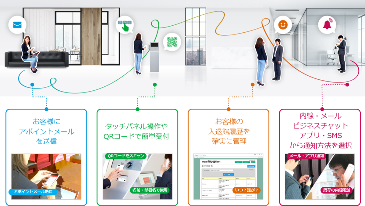 moreReceptionは、新しい “おもてなし” のカタチを実現し「受付業務」を変革、働き方改革にも貢献します。