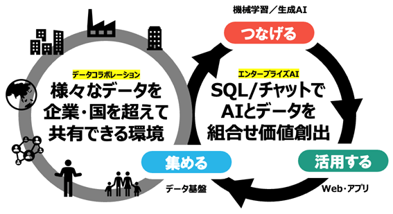 AIデータクラウドとは、企業や国を越えてさまざまなデータを共有しつつ、AIでデータを組み合わせて価値を創出するプラットフォームです。