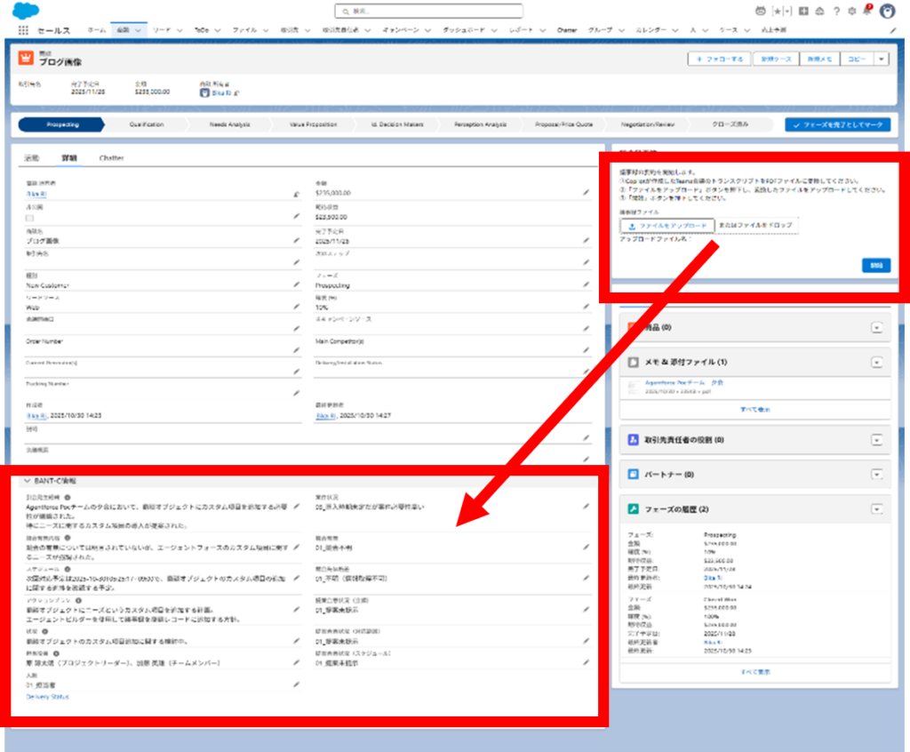 AgentforceとSalesforceを連携してMicrosoft Teamsのトランスクリプト機能で作成した議事録ファイル(PDF)をAgentforceで要約し、その結果をSalesforceの商談オブジェクトに自動的に取り込む仕組みを作ります。今まで議事録作成、レビュー依頼にかかっていた作業が大幅に短縮でき、コスト削減ができると考えます。