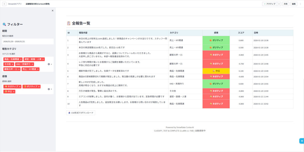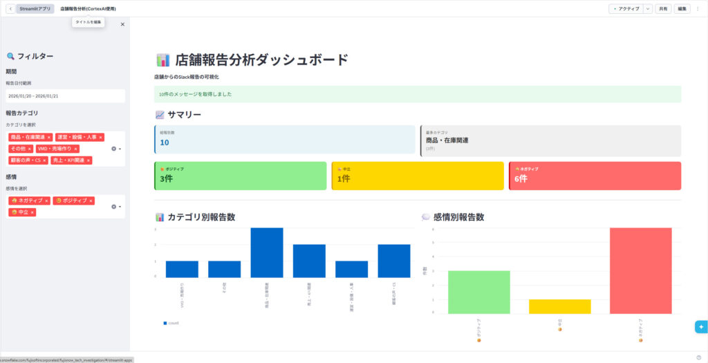 ⇒Cortex AI関数を使い、膨大なメッセージを「売上・KPI関連, 商品・在庫関連,顧客の声・CS」等に自動分類し、感情分析(ポジティブ/ネガティブ)を行います。 - 検証ステップ③:Streamlit in Snowflakeでダッシュボード化