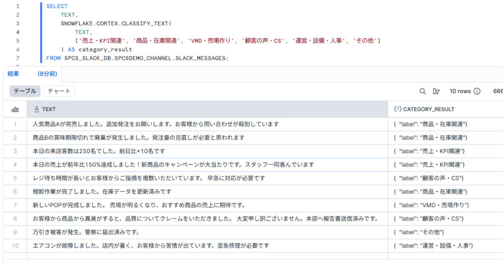① SNOWFLAKE.CORTEX.CLASSIFY_TEXT (カテゴリ分類)