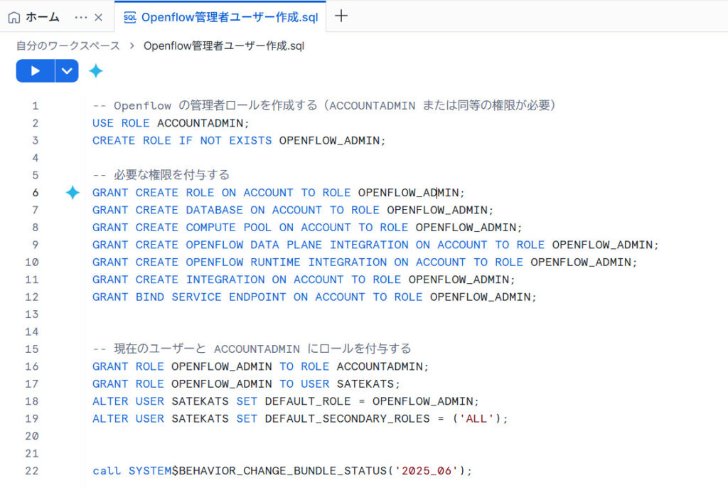 ・ロールと権限の設定: ACCOUNTADMIN ロールなどを使用し、Snowflake Openflowの管理ロール(例: OPENFLOW_ADMIN)やコンピューティングプール作成権限を作成・付与します。