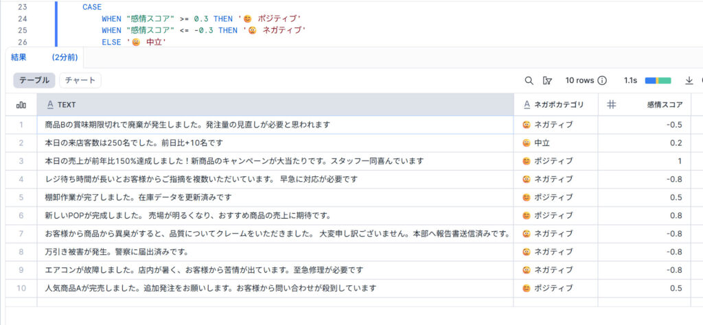 WHEN "感情スコア" >= 0.3 THEN '😊 ポジティブ'