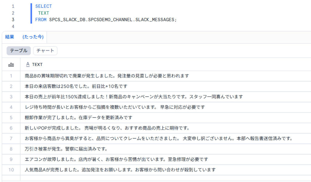 Slackのメッセージが、テーブルに連携されていることが確認できます。