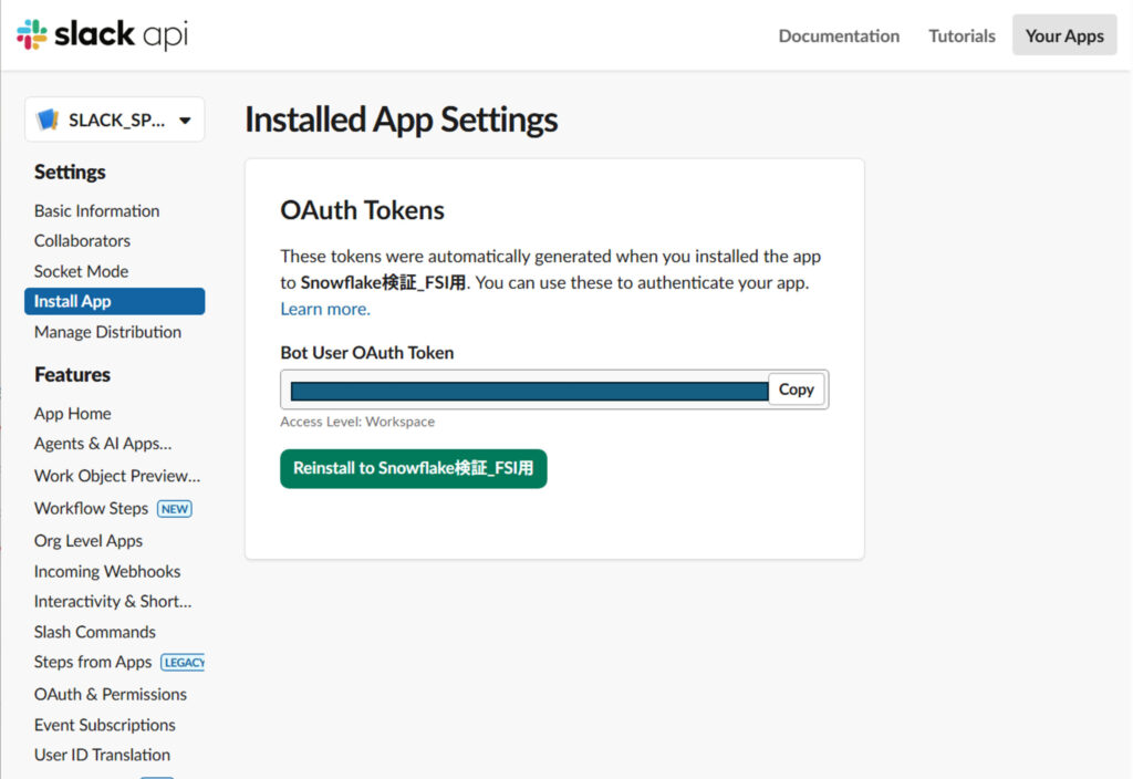 ・トークンの取得: 設定に必要な「Bot User OAuth Token」および「App-level Token」をメモしておきます